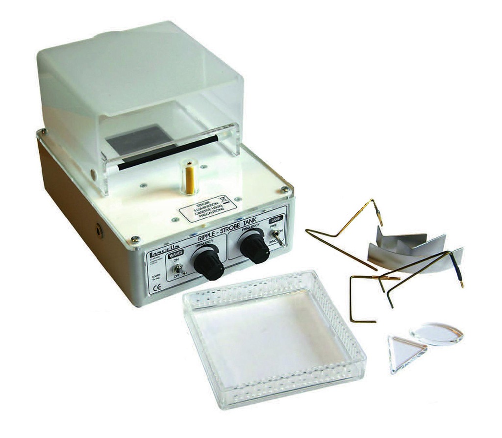 Elle permet d'observer les phénomènes de diffraction, réfraction et interférences. La cuve est positionnée sur une base qui produit les ondes et la lumière. Les ondes sont observables sur un écran blanc situé au-dessus de la cuve. La fréquence des ondes est réglable. La fréquence du stroboscope peut être synchronisée avec la fréquence d'excitation, ou réglable manuellement à l'aide d'un potentiomètre.