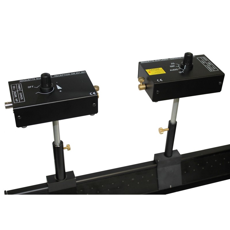 Utilisation sur banc d’optique ou sur paillasse. Possibilité de connecter directement un GBF via l’entrée BNC ou un microphone via l’entrée jack. Cet ensemble peut être utilisé avec ou sans fibre optique.